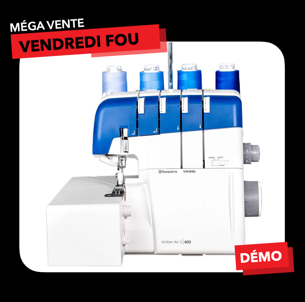 à air, enfile-aiguille intégré, alimentation différentielle, longueur de point réglable, largeur de coupe et pression du pied presseur, et couture 4,3, 2 fils.