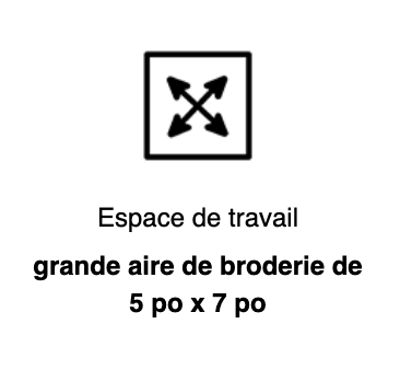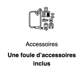 - Accessoires inclus : Assortiment de pieds inclus (pied zigzag, pied pour monogramme, pied pour faufilage, pied pour fermeture éclair, pied pour point invisible, pied pour boutonnière, pied pour broderie), jeu d’aiguilles, aiguilles jumelées, canettes, découseur, ciseaux, brosse de nettoyage, perce-œillet, tournevis (grand, petit, disque), porte-bobine, feuille d’instructions, porte-bobine horizontal, couvercles de bobine (grand, moyen, petit), porte-bobine pour mini-bobines et bobines géantes, filet de bobine, levier au genou, boîtier de canette standard (marque verte sur la vis) (sur la machine), boîtier de canette de remplacement (aucune couleur sur la vis), pédale, ensemble de cadres de broderie (grand), 18 cm (H) x 13 cm (L) (7 po x 5 po), fil de canette à broderie (grammage 60, blanc), sac à accessoires, feuilles de broderie, manuel d’utilisation, Guide de référence rapide, Guide des motifs de broderie.