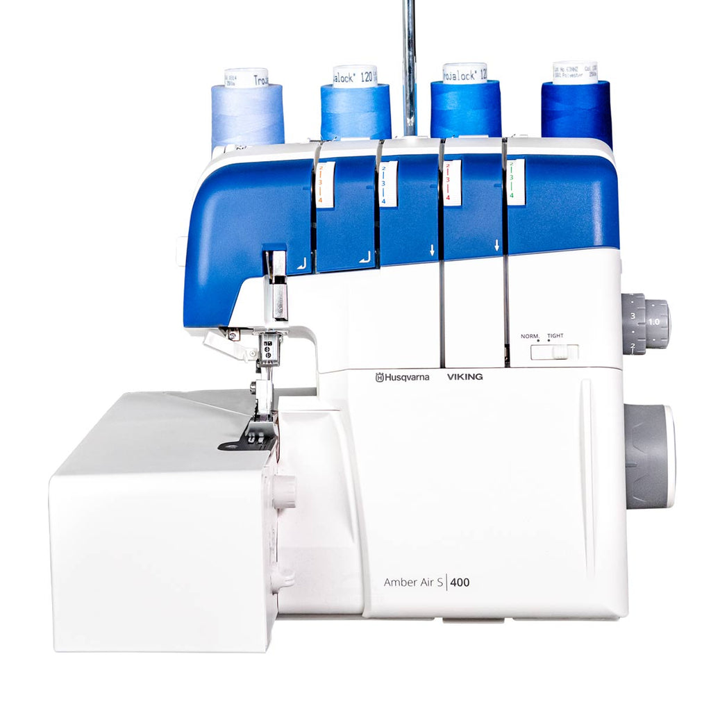 à air, enfile-aiguille intégré, alimentation différentielle, longueur de point réglable, largeur de coupe et pression du pied presseur, et couture 4,3, 2 fils.